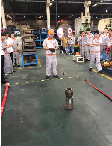 在比賽開始之前,工會主席呂曦紅、生產(chǎn)總監(jiān)蔡云峰、研發(fā)中心工程師李軍輝都到現(xiàn)場進行了相應的賽前道具準備、場地劃線。同時對比賽的安全操作、比賽流程做了詳細的講解,以確保員工安全比賽、了解賽事規(guī)則。本項目之所以叫“趣味行車”比賽,就是需要三人接力、按照用時最短的原則,將一個圓柱物體用行車吊裝進空心的圓柱體內。這對于平時操作行車的熟練程度、技藝都有較高的要求。