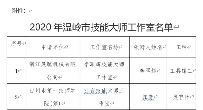 我司根據(jù)《關(guān)于深入實施2020年度溫嶺市技能大師工作室項目建設(shè)及考核評估的通知》(溫人社發(fā)〔2020〕59號)文件精神,通過自行推薦以及地方政府的大力支持,充分準(zhǔn)備了相關(guān)申報資料,通過主管部門的初審以及專家的評審、部門審議和社會公示等評選環(huán)節(jié),我司最終順利通過評審,被評定為“李軍輝技能大師工作室”并于政府平臺公示。