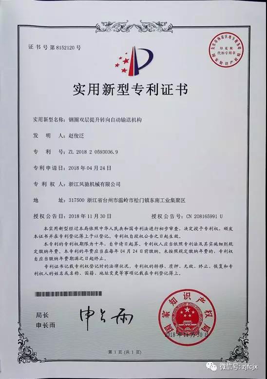 2018年11月榮獲“鋼圈雙層提升轉向自動輸送機構”實用新型專利證書