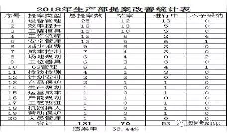 2018年,生產部各車間合計提案改善131件,完結70件,推進中53件,不予采納8件。大家的提案,涉及到生產管理的方方面面,非常廣泛。